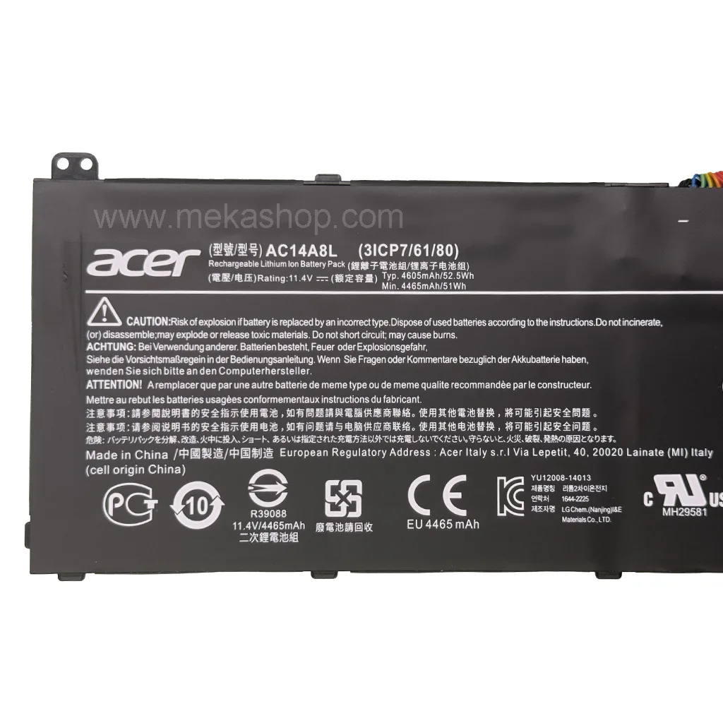 باتری لپ تاپ نو و آکبند سازگار با باتری اورجینال لپ تاپ ایسر Pn: AC14A8L) Acer Aspire V15 Nitro) از سلول های اورجینال و با کیفیت لیتیوم یون ساخته شده است که ضمن شارژ کوتاه مدت، از زمان نگهداری شارژ بالائی برخوردار است. این باتری داخلی یا همان اینترنال است که کیفیت این باتری بعد از ساخت در کارخانه سازنده، با آزمایشات مختلف تضمین شده است.
